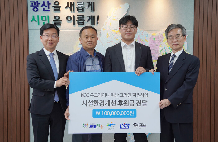 지난 25일 광주광역시 광산구청에서 열린 고려인 마을 기부금 전달식에는 광산구청 박병규 구청장, KCC 광주영업소 임근홍 지점장, 사단법인 고려인 마을 이천영 교장, 한국해비타트 이광회 사무총장 등 관계자 11명이 참석해 실질적인 지원 방안에 대해 논의했다. KCC는 고려인 동포의 안정된 정착을 위해 빈집을 개보수하고 주변 환경 정비에 나서며 KCC의 전문 인력과 고품질 친환경 건축자재를 투입할 예정이다.