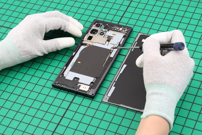 ▲ 갤럭시 S22 울트라 제품을 자가 수리 하는 모습. [사진=삼성전자] |