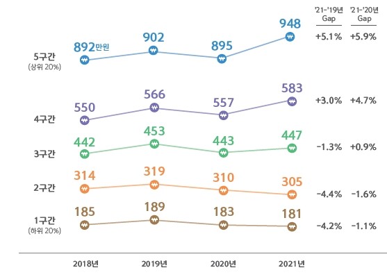 | ▲ 코로나19로 감소했던 가구 총소득은 상위 40% 4·5구간만 회복했다. [그래픽=신한은행 제공] |