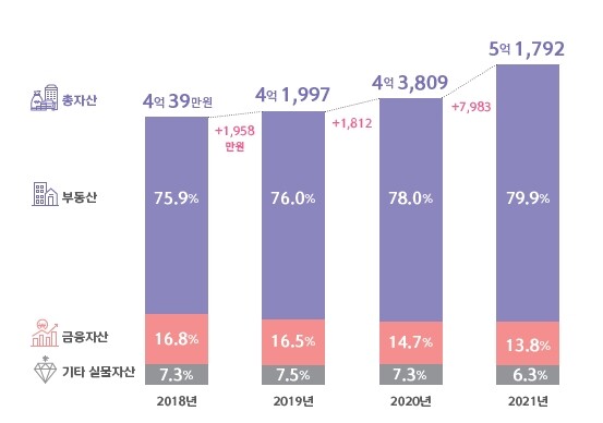 | ▲ 총자산은 2021년 5억원을 돌파했고, 부동산 쏠림 현상은 심화됐다. [자료=신한은행 제공] |