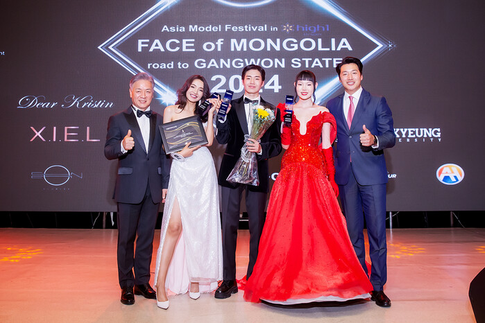 | ▲ 완쪽부터 아시아모델페스티벌조직위원회 양의식 회장, 몽골모델 나질리, 튄그스일트게트, 콩고르줄, 몽골패션예술협회 앵흐바트 인디고 회장. [사진=아시아모델페스티벓] |