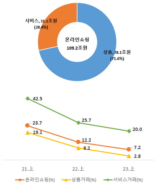 대한상공회의소(회장 최태원)가 29일 발간한 ‘2023 유통물류 통계집’에 따르면, 올해 상반기 온라인 전체 쇼핑거래액은 109.2조원으로 전년동기대비 7.2% 성장했으나, 최근 3년간 성장률은 하향추세인 것으로 드러났다.