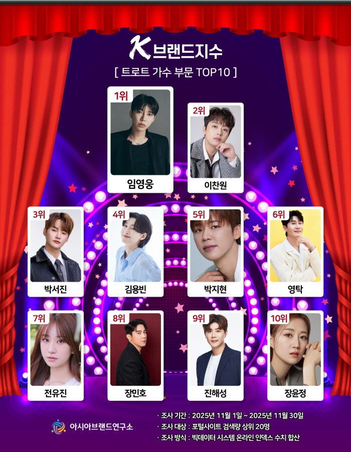 이번 K-브랜드지수 트로트 가수 부문은 포털사이트 검색량 상위 20명을 대상으로, 2025년 11월 1일부터 11월 30일까지의 온라인 빅데이터 5억 7364만 8387건을 분석했다.