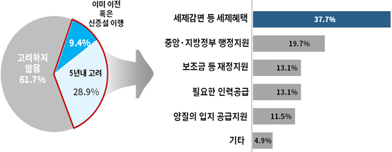 한편, 비수도권으로의 이전 및 신·증설을 고려 않고 있는 기업들에게 ‘어떤 정책적 지원을 확대하면 효과가 있을지’를 묻자, ‘필요인력의 원활한 공급’(38.8%), ‘세제감면이나 공제 등의 세제혜택’(23.5%), ‘보조금 등의 재정지원’(20.4%) 순으로 답했다.