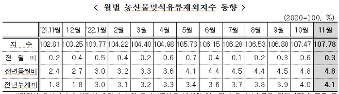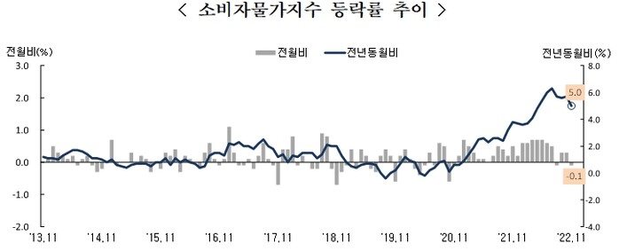 11월 소비자물가 상승률은 지난 4월(4.8%) 이후 가장 낮지만 지난 5월(5.4%) 이후 7개월째 5%가 넘는 고공행진을 이어가고 있다.