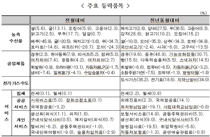 양파(27.5%), 무(36.5%), 감자(28.6%), 양배추(36.0%) 등은 올랐으나 오이(-35.3%), 상추(-34.3%), 호박(-34.9%), 고구마(-13.5%), 쌀(-10.0%), 사과(-8.0%) 등은 내렸다.