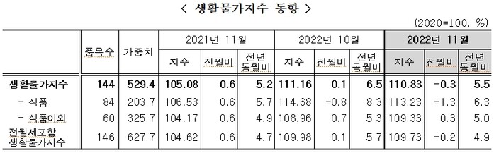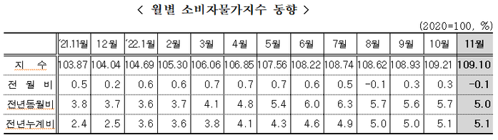 지난 2일 통계청이 발표한 ‘11월 소비자물가동향’에 따르면 지난달 소비자물가지수는 109.10(2020년=100)으로 전년 동월 대비 5.0% 올랐다. 전월(5.7%)에 비해서는 0.7%포인트(p) 낮아졌다.