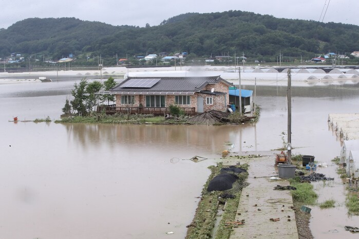 ▲KB국민·신한·하나·우리금융 등 4대 금융그룹이 폭우피해 돕기를 위해 모두 35억원의 성금을 기부하고 특별대출과 만기연장, 상환유예 등 긴급 금융지원에 나섰다. 지난 16일 오후 배수장 인근 지천 제방 붕괴로 물이 범람해 폭우피해를 당한 충남 청양군 청남면 일대 침수 현장의 모습 [사진=연합뉴스] |