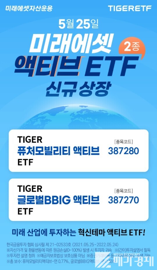 미래에셋자산운용은 25일 신규 상장하는 TIGER 액티브 ETF 2종 거래고객을 대상으로 이벤트를 진행한다고 밝혔다. 신규 상장하는 ETF는 ‘TIGER 퓨처모빌리티 액티브 ETF’와 ‘TIGER 글로벌BBIG 액티브 ETF’다.