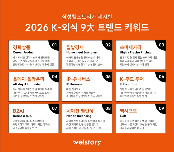 삼성웰스토리는 2026년 외식 산업의 변화 방향과 핵심 키워드를 담은 트렌드 도서 『2026 K-외식 패러다임 대전환』을 출간했다고 28일 밝혔다. 이번 도서는 외식 식자재 고객사인 F&B 기업은 물론 업계 종사자 전반에 비즈니스 성장에 필요한 인사이트를 제공하기 위해 기획됐다.