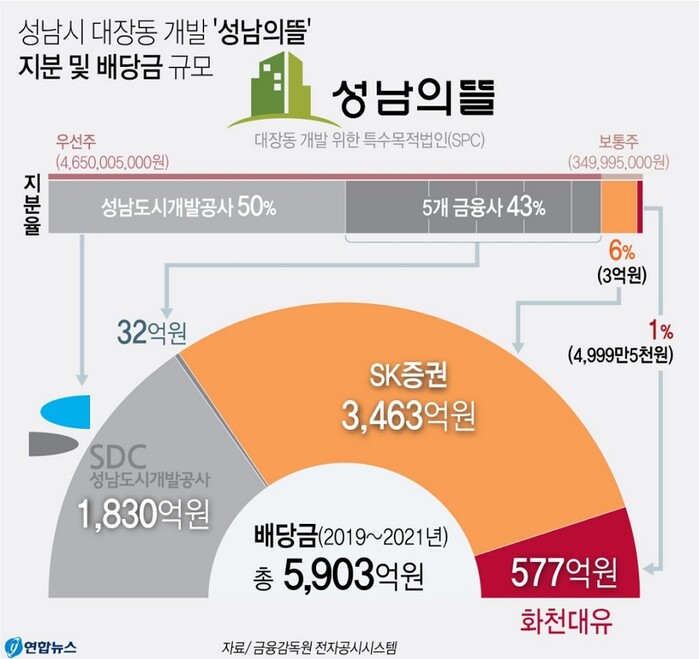 문재인 정부 들어 부동산 가격이 폭등하면서 배당 첫 해인 2018년부터 지난해까지 성남시는 우선주로 1830억원을 배당받았다. 성남의뜰 지분 6%를 보유한 SK증권은 3463억원을, 화천대유 소유주인 언론인 출신 A씨는 보통주로 577억원을 받았다.
