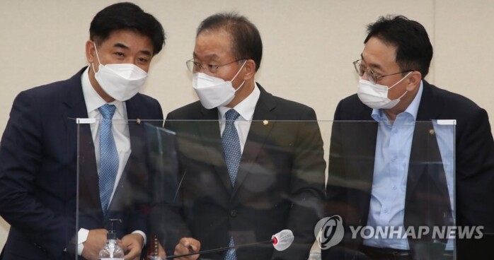 | ▲ 윤재옥 정무위원장(가운데)이 29일 국회에서 열린 정무위원회 전체회의에서 더불어민주당 김병욱 간사(왼쪽), 국민의힘 김희곤 간사와 국정감사 증인 채택 등과 관련해 논의하고 있다. [사진=연합뉴스] |
