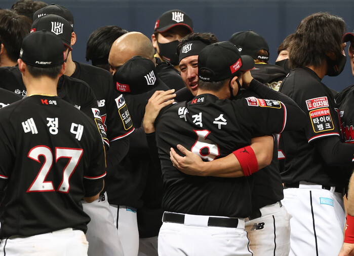 ▲ 18일 창단 첫 통합우승을 달성한 kt 황재균과 박경수가 포옹하며 흐느끼고 있다. kt 위즈 주장 황재균(34)은 팀의 창단 첫 통합우승을 완성한 한국시리즈(KS) 4차전에서 1회초 좌중간을 가르는 1타점 2루타로 결승타의 주인공이 됐다. [서울=연합뉴스] |