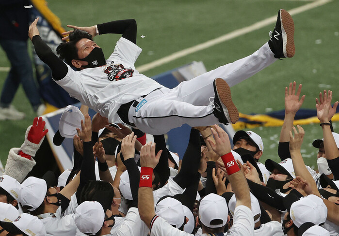 ▲ 18일 서울 구로구 고척스카이돔에서 열린 2021신한은행 SOL KBO 포스트시즌 한국시리즈 4차전 kt 대 두산 경기 8-4 승리로 창단 첫 통합우승을 달성한 kt 선수들이 이강철 감독을 헹가래치고 있다. [서울=연합뉴스] |