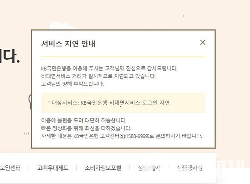 ▲ 5월20일 오후 5시 15분께부터 KB국민은행 인터넷뱅킹과 모바일뱅킹(KB스타뱅킹) 서비스에서 접속 지연 현상이 나타났다. [자료=KB국민은행 장애공지 화면 캡쳐] |