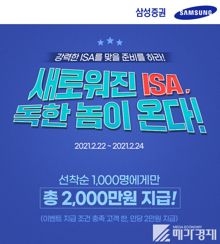 '새로워진 ISA, 독한 놈이 온다!' 이벤트와 관련한 자세한 내용은 삼성증권 홈페이지의 이벤트 페이지를 참고하거나 패밀리 센터에 문의하면 된다.