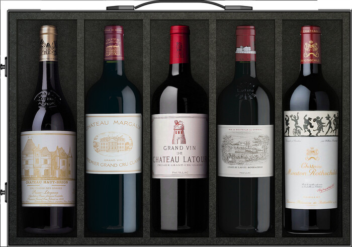 이번 세트에는 샤또 라피트 로칠드, 샤또 라투르, 샤또 마고, 샤또 오브리옹, 샤또 무통 로칠드 등 프랑스 5대 샤또 1등급 그랑크뤼가 모두 포함됐다. 이들 와인은 170년이 넘는 기간 동안 단 한 번도 등급이 변경되지 않으며 최정상의 지위를 유지해 왔다.