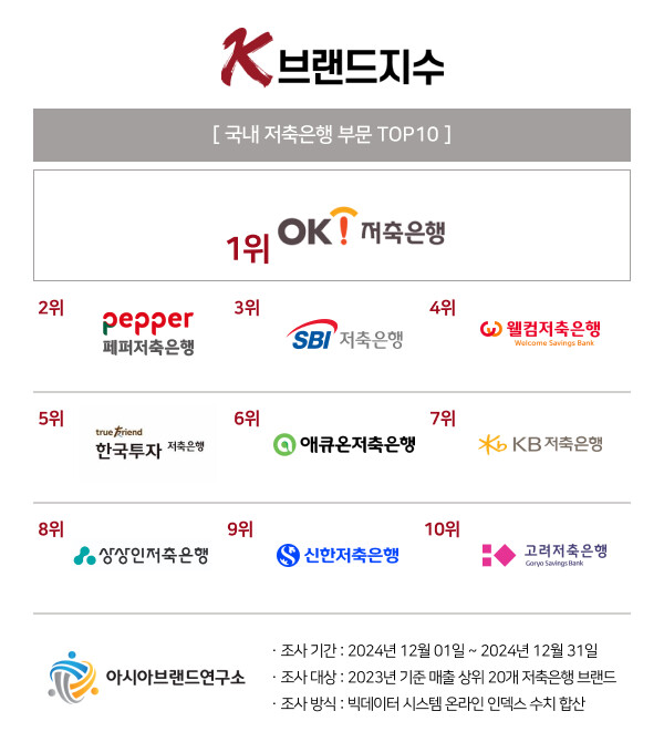 K-브랜드지수 저축은행 부문은 OK저축은행이 1위를 수성했으며, 페퍼저축은행(2위), SBI저축은행(3위), 웰컴저축은행(4위), 한국투자저축은행(5위), 애큐온저축은행(6위), KB저축은행(7위), 상상인저축은행(8위), 신한저축은행(9위), 고려저축은행(10위)이 TOP10에 이름을 올렸다.