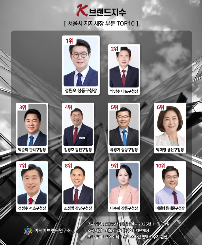 한정근 아시아브랜드연구소 대표는 “이번 K-브랜드지수 서울시 지자체장 부문에서는 생활권 중심의 민심 변화가 순위에 직접적으로 반영된 점이 특징이다. 정원오 성동구청장이 또 다시 1위를 차지한 것은 행정 정책 안정성과 주민 체감도 개선이 체계적으로 이어졌다는 신호로 풀이된다”고 평가했다.