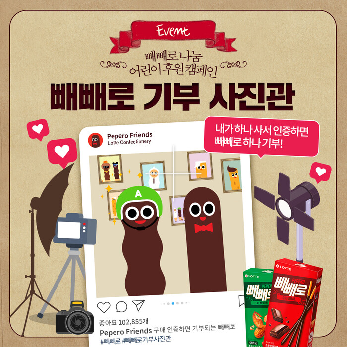 빼빼로 기부 사진관 이벤트는, 소비자가 관련 사진이나 영상을 SNS에 게재하면 게시물 수 만큼 롯데제과가 아동관련 복지단체에 제품을 기부한다.