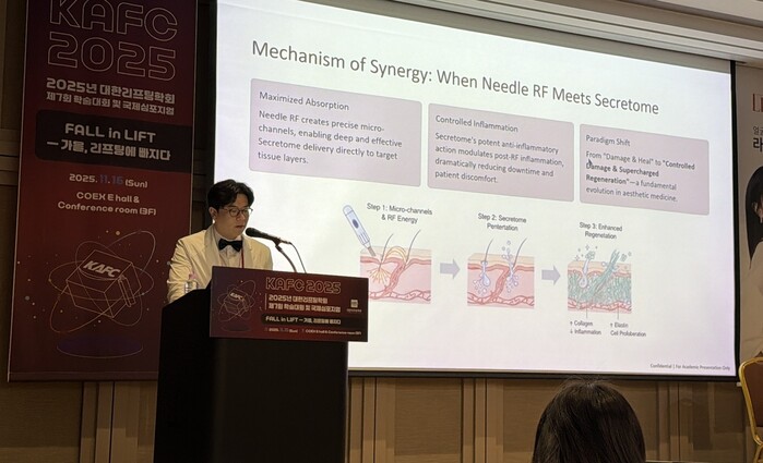 이날 발표에서 최 원장은 니들 RF와 ‘칼레심(CALECIM) PTT-6 시크리톰’을 함께 적용하는 복합 관리 프로토콜을 소개했다. 그는 니들 RF 시술 과정에서 형성되는 미세 채널이 제품 흡수 효율을 높여 시술 직후 피부 컨디션 관리에 적합한 구조를 만든다며, “자연 회복을 기다리는 방식에서 벗어나 보다 적극적이고 체계적인 사후 관리가 필요하다”고 설명했다.