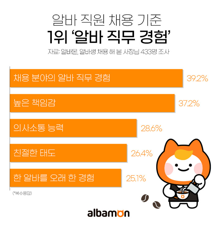 ▲알바몬이 알바 사장님을 대상으로 채용기준에 대해 조사했다. [사진=알바몬] |