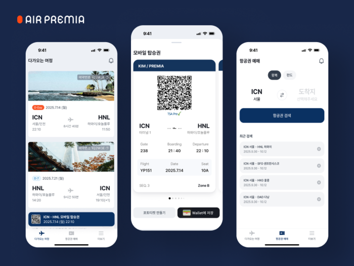 예약 고객의 ‘다가오는 여정’이 첫 화면에 우선 표시되며, 에어프레미아 공식 홈페이지뿐 아니라 여행사나 기타 채널에서 구매한 항공권도 ‘여정 조회’ 기능을 통해 등록 후 체크인 및 모바일 탑승권 사용이 가능하다. 기존 고객들에게 호응을 얻고 있는 ‘포토티켓’ 기능도 그대로 제공된다.