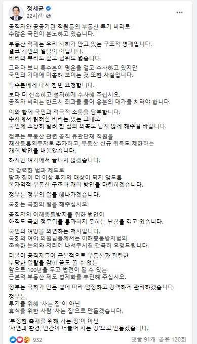 그러면서 "불공정의 가장 중요한 뿌리인 부동산 적폐를 청산한다면 우리나라가 더 투명하고 공정한 사회로 가는 분기점이 될 것"이라며 "이번 사건을 공공기관 전체에 대한 근본적 개혁의 기회로 삼아야 한다"고 밝혔다.