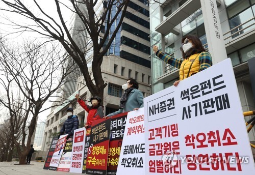 | ▲ 옵티머스 펀드 사태 관련 2차 제재심의위원회가 열린 지난 4일 오후 금융감독원본원 앞에서 옵티머스 피해자들이 최대 판매사인 NH투자증권과 수탁사인 하나은행에 대한 중징계를 촉구하고 있다. [사진=연합뉴스 제공] |