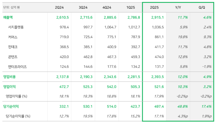 매출액은 서치플랫폼, 커머스 등 주요 사업 부문의 견조한 성장으로 전년 동기 대비 11.7% 증가했으며, 영업이익도 전년 동기 대비 10.3% 올랐다.