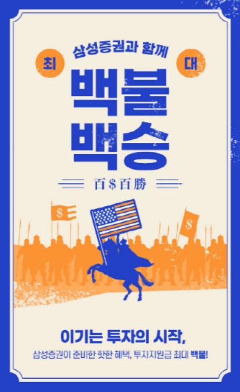 | ▲ 삼성증권(대표 장석훈)은 해외주식 거래 경험이 없었던 고객을 대상으로 최대 100달러를 지원하는 이벤트를 2월 28일까지 진행한다. [포스터=삼성증권 제공] |