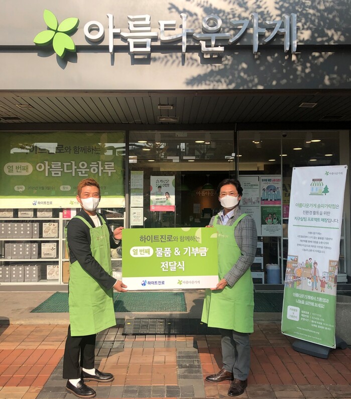 ▲사진 왼쪽부터 최수영 아름다운가게 서울사업국장, 정세영 하이트진로 수석팀장 (사진 = 하이트진로 제공) |