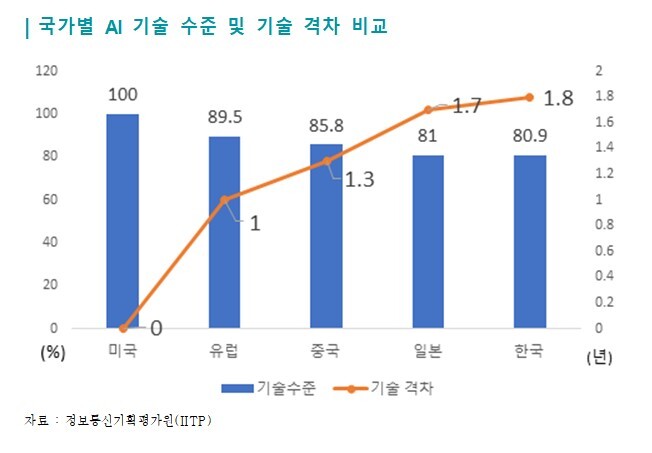 2020년 기준 미국을 100%로 놓자면, 중국의 AI 기술 수준은 85.8% 수준이다. 유럽 89.5%에 이어 글로벌 3위 수준. 한국은 80.9%다.
