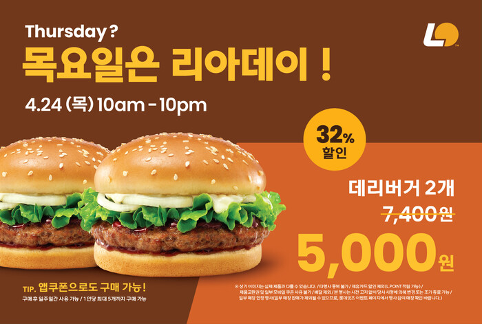 ‘리아데이’는 롯데리아가 고객을 위해 매월 특정 제품을 선정해 높은 할인율이나 제품 추가 증정해 고객 호응이 높은 행사다. 이번 리아데이는 남녀노소가 좋아하는 롯데리아 인기 메뉴 데리버거로 준비했으며, 데리버거 2개를 5000원에 판매해 정가 대비 약 32% 할인된 가격으로 저렴하게 구매 가능하다.