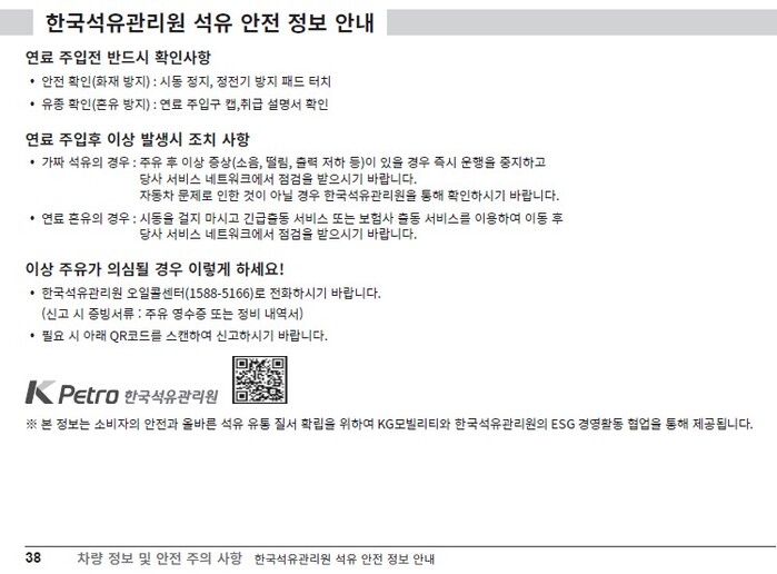 KGM은 향후 자동차 취급설명서(모바일 앱·홈페이지·책자 등)에 ▲연료 주입 전 운전자 확인 요청 ▲비정상 연료 주입 후 조치 방법 ▲한국석유관리원 신고 안내(QR코드 및 오일콜센터 등을 추가해 운전자가 실제 상황에서 즉시 대응할 수 있도록 지원할 방침이다.