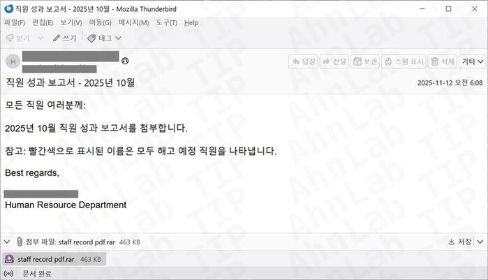 안랩이 공개한 사례에 따르면 공격자는 기업 인사팀을 사칭해 ‘직원 성과 보고서’라는 제목의 이메일을 발송했다. 특히 연말연시 인사 평가, 조직 개편, 성과급 안내 등 관련 메일이 잦아지는 시기를 노려 임직원의 경계심이 낮아진 틈을 공략한 것이 특징이다.