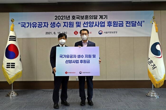 ▲사진 왼쪽부터 이성춘 서울지방보훈청장, 정찬우 롯데칠성음료 HR부문장 (사진 = 롯데칠성음료 제공) |