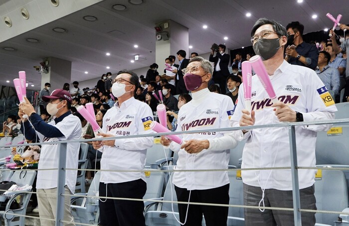 | ▲ 지난 20일 서울 고척 스카이돔에서 열린 키움 히어로즈와 삼성 라이온즈 프로야구 경기에서 윤종규 KB금융그룹 회장(오른쪽에서 두번째), 민기식 푸르덴셜생명보험 사장(오른쪽 첫번째), 이환주 KB생명보험 사장(왼쪽에서 두번째)이 임직원들과 함께 열띤 응원을 펼치고 있다. [사진=푸르덴셜생명보험 제공] |