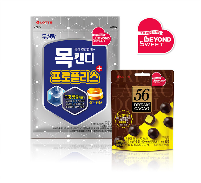 롯데제과가 비욘드스위트 프로젝트로 처음 선보인 제품은 ‘목캔디 프로폴리스 허브진저’, ‘드림카카오 56 비타민E’ 등 2종이다.