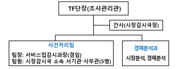 TF는 조사관리관(TF 단장) 산하에 신설되는 전담 사건처리팀과 경제분석과가 유기적으로 협조하는 체제로 구성되었다. 사건처리팀은 직원(서기관·사무관) 5명을 배정하여 배달플랫폼 사건만 전담하여 처리토록 하고, 경제분석과는 사건처리팀과 함께 주요 행위에 대한 심도 있는 경제분석을 진행할 예정이다.