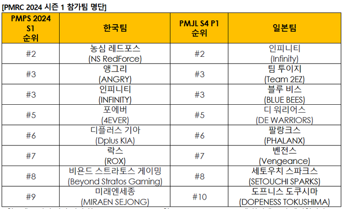 일본도 ‘배틀그라운드 모바일 재팬 리그(PUBG MOBILE JAPAN LEAGUE, 이하 PMJL)’ 시즌 4 페이즈 1 정상에 오른 CAG 오사카가 PMWC에 직행했고, 2위부터 9위까지의 8개 팀이 PMRC 2024 시즌 1에 참가한다. 다만 9위를 차지한 리젝트가 이미 '2024 배틀그라운드 모바일 글로벌 오픈(2024 PUBG MOBILE GLOBAL OPEN)' 우승팀 자격으로 PMWC 진출권을 거머쥔 만큼, 10위의 도프니스 도쿠시마가 출전한다.