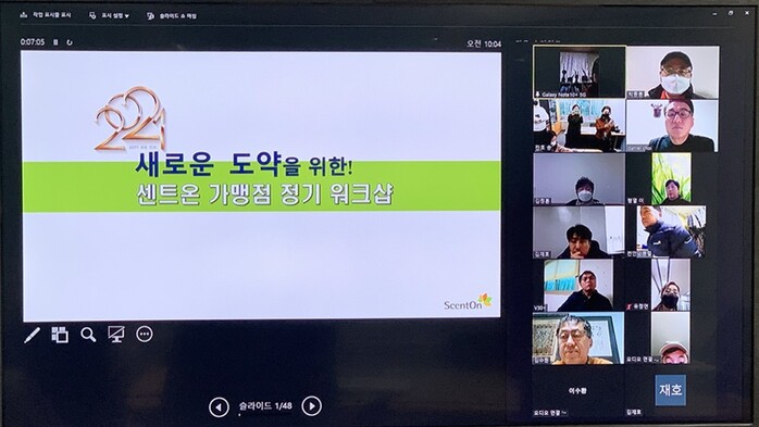 ▲ 센트온 임직원과 가맹점주들이 비대면 화상회의 형식의 ‘2021년 정기 전략 워크숍’을 진행 중이다. [사진=센트온 제공] |