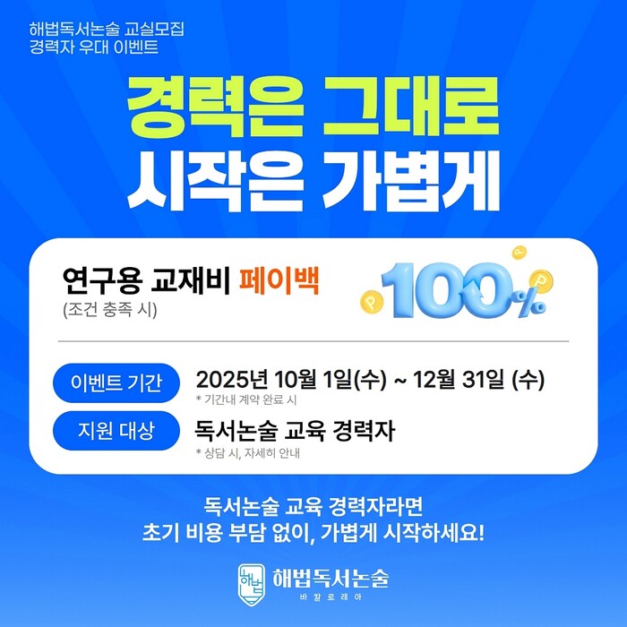 이번 경력자 우대 이벤트를 통해 독서논술 교육 경력자에게 연구 교재비 페이백 혜택을 추가로 제공해 초기 투자 비용을 획기적으로 줄일 수 있도록 지원한다. 이벤트 조건은 계약 후 3개월간 출고 수량과 관련된 내부 영업 기준에 따라 적용되며, 자세한 사항은 각 지사를 통해 안내된다.