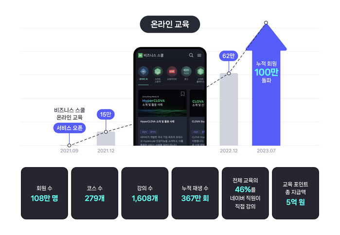 8년간 '네이버 스퀘어'를 운영하며 쌓아 온 노하우와 교육 콘텐츠, 비즈니스 데이터를 기반으로 보다 체계적인 교육 코스워크를 준비해 선보인 결과, 론칭 2주년을 맞은 현재 온라인 교육 회원수는 108만 명을 돌파했다. 온라인 교육 코스는 지난해 대비 2배 이상 넘게 증가한 279개가 열려있다.