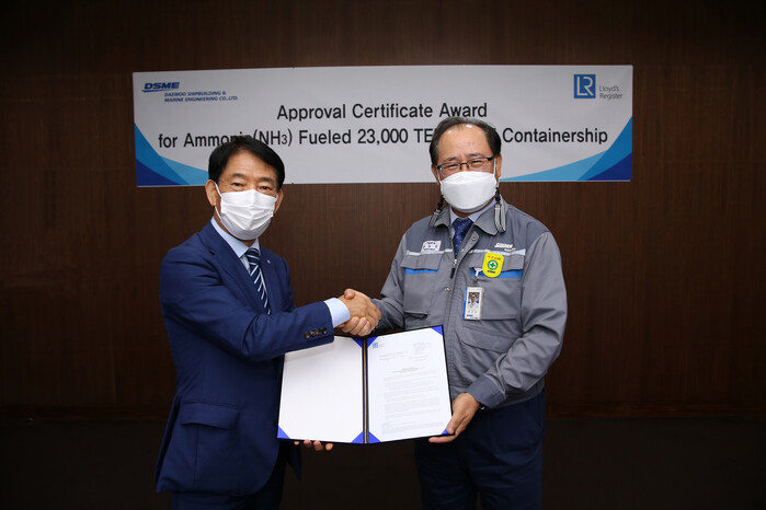 대우조선해양은 영국 로이드선급(LR)으로부터 2만3천TEU(1TEU는 20피트 컨테이너 1개)급 암모니아 추진 초대형컨테이너선에 대한 기본인증(Approval in Principle)을 획득했다고 6일 밝혔다.