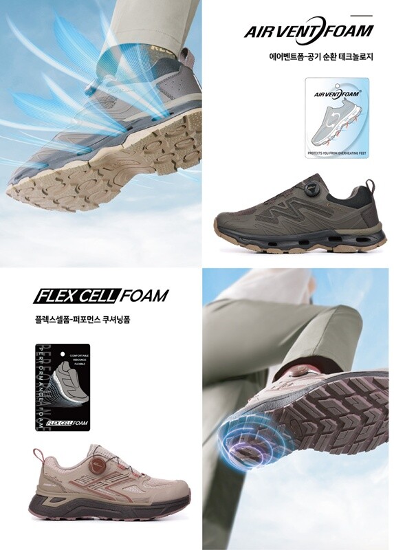 또한 각 상품의 특장점은 미드솔에서 두드러진다. 콘트라 벤트 노바 워킹화는 공기 순환 기술인 에어 벤트 폼을 적용했다. 이는 미드솔에 적용된 홀을 통해 신발 내부의 열은 내보내고 신선한 공기를 유입시킨다. 덕분에 오랜 시간 걸어도 땀이 차지 않고 발이 쾌적하다.