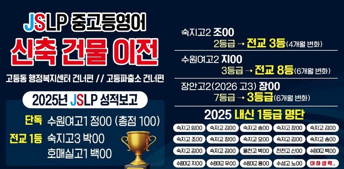 학원 관계자는 “JSLP는 지난 10년간 수원 지역 중·고등 영어 내신에 특화된 자체 교육 시스템과 교재 개발에 집중해왔다”며 “이번 본원 이전은 단순한 공간 이동이 아닌, 보다 쾌적하고 안전한 환경에서 학생들의 학습 몰입도를 높이기 위한 결정”이라고 밝혔다.