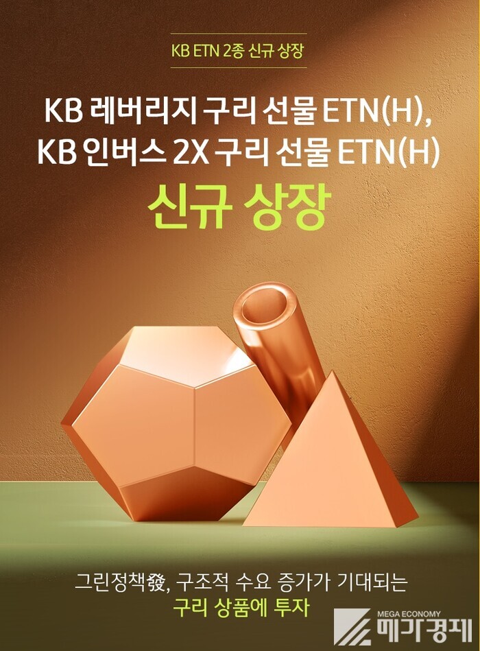 | ▲ KB증권은 코멕스에 상장되어 있는 구리 선물에 투자하는‘KB 레버리지 구리 선물 ETN(H)’및‘KB 인버스 2X 구리 선물 ETN(H)’을 신규 상장한다. [이미지=KB증권 제공] |