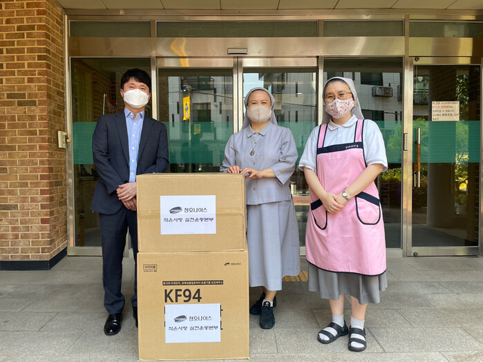 청호나이스(회장 정휘동) 사내 봉사단체인 '작은사랑 실천운동본부'가 23일 경기도 시흥에 위치한 노인요양보호시설 '글라라의 집'을 비롯한 5개 사회복지기관에 국내생산 방역마스크 1만6500장을 전달했다.