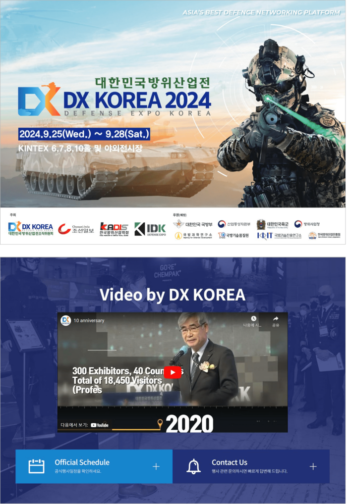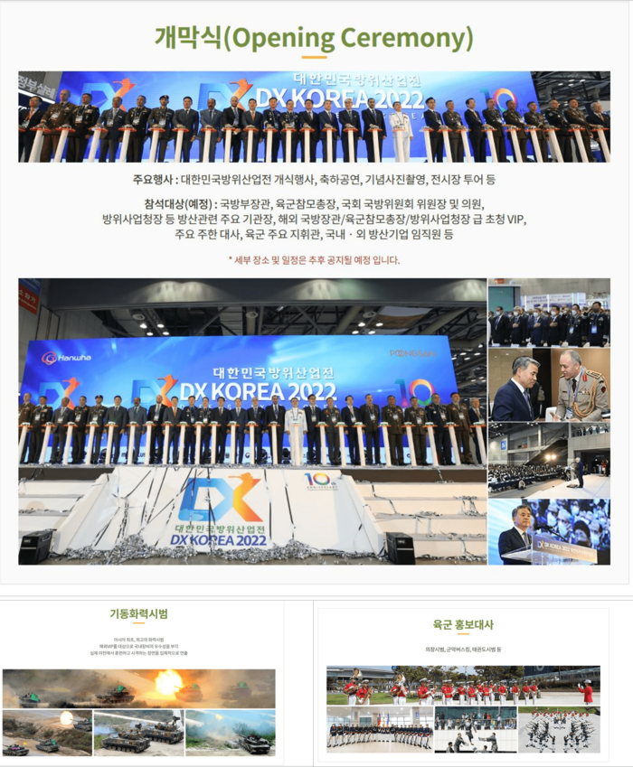 22일 관련 업계에 따르면 DX KOREA는 국방부와 육군, 방위사업청으로부터 후원을 받지 못한 상태지만 홈페이지와 홍보자료에는 후원예정이라는 문구를 사용하고 있다. 아직 후원을 받지 못했으나 곧 국방부·육군 등의 후원 결정을 받을 것으로 암시하고 있는 것이다.